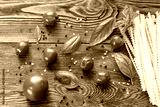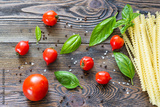 Pasta ingredients. Cherry-tomatoes, spaghetti pasta, basil and s