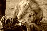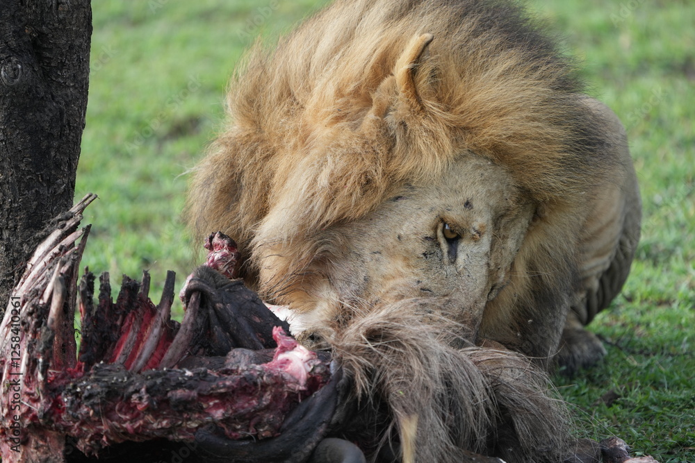 male lion (king of the savanna) eating a wildebeest carcass, gnu carcass, in the serengeti national park tanzania