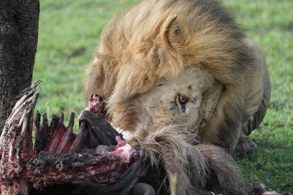 male, lion, alpha, panthera leo, leo, panthera, safari, serengeti national park, serengeti, carcass, wildebeest, gnu, gnu carcass, animal, cat, wild, circle of life,mane, wildlife, king, carnivore, fe
