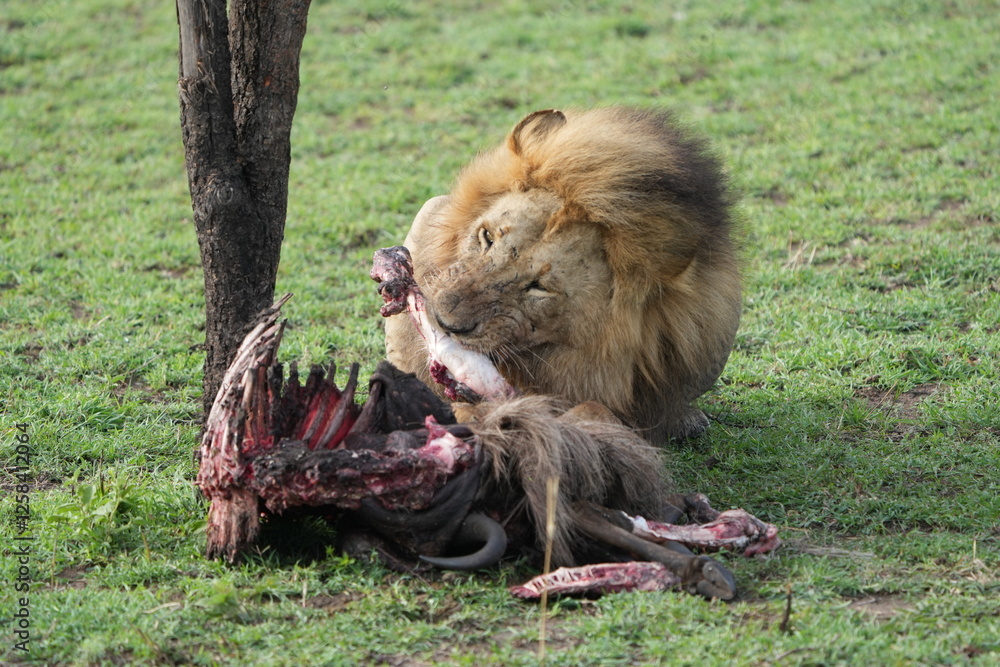 male lion (king of the savanna) eating a wildebeest carcass, gnu carcass, in the serengeti national park tanzania