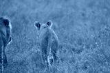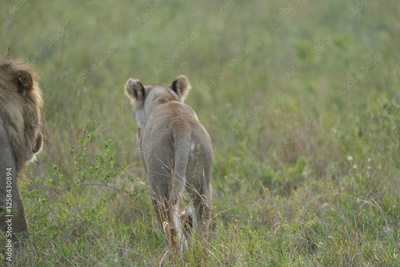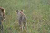 female lion walking away from the camera, portrait against the morning grass of the serengeti wallpaper