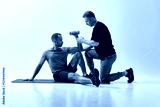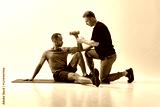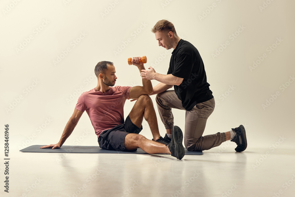 Trainer helping man perform seated dumbbell curl, guiding arm movement to ensure correct rehabilitation technique against studio background. Concept of rehabilitation, recovery, healthcare, sport