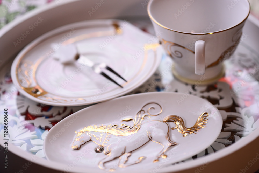 A decorative gold horse figurine sits atop a white plate, perfect for use in still life photography or as a prop for fantasy or whimsical scenes.