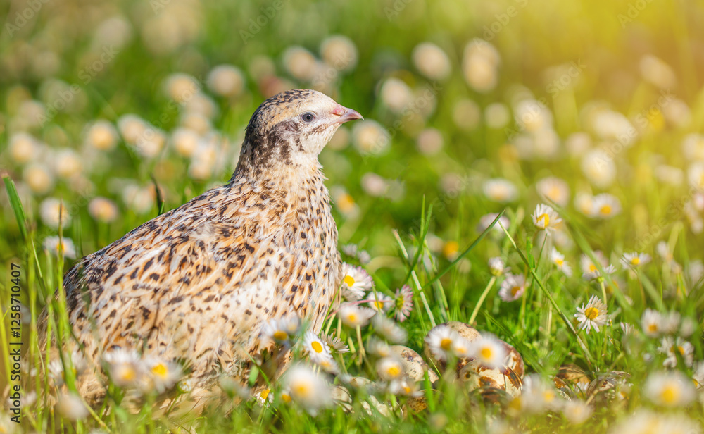 Common quail bird, domestic quails on grass, concept of ecological farm products