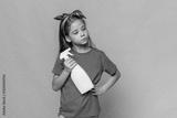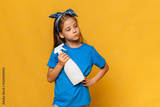 Little girl in blue t-shirt and headband holding detergent spray in her hands and looks at empty space yellow background. Housekeeping and home cleaning concept. Cleaning services. Copy space