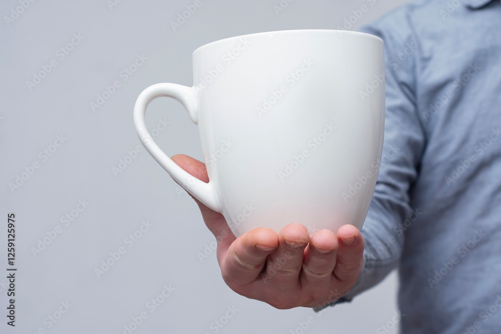 Closeup of a hand holding a mockup of a large white mug on a light background. Concept for use in logo in branding.