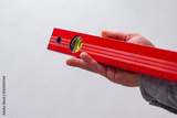 Close-up of a hand holding a red construction level. Tool for DIY, repair, and accuracy.