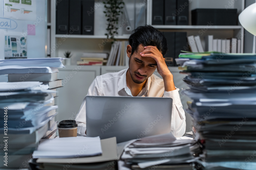 Depressed Asian male feel worried about financial problem in business.
