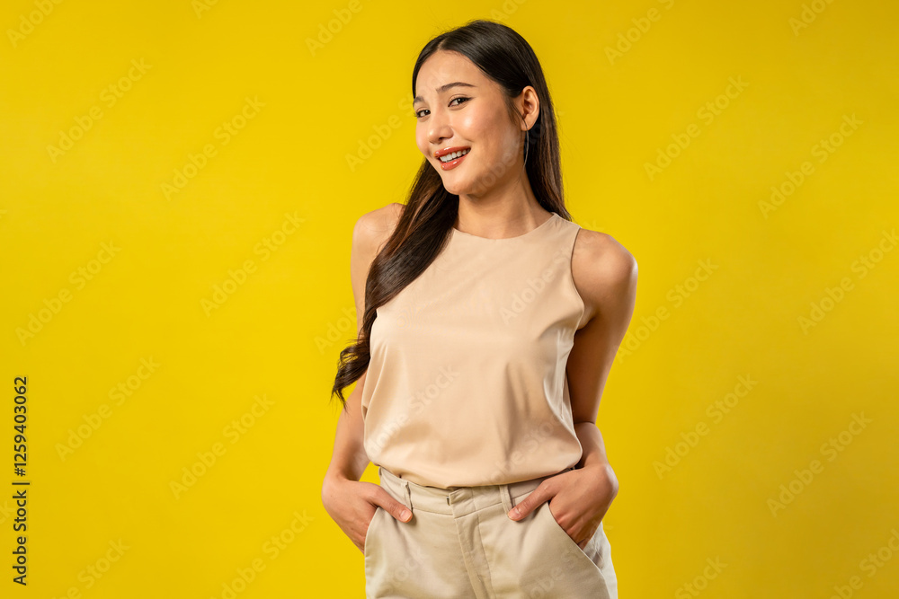 Portrait of Asian beautiful woman standing in isolated yellow background.