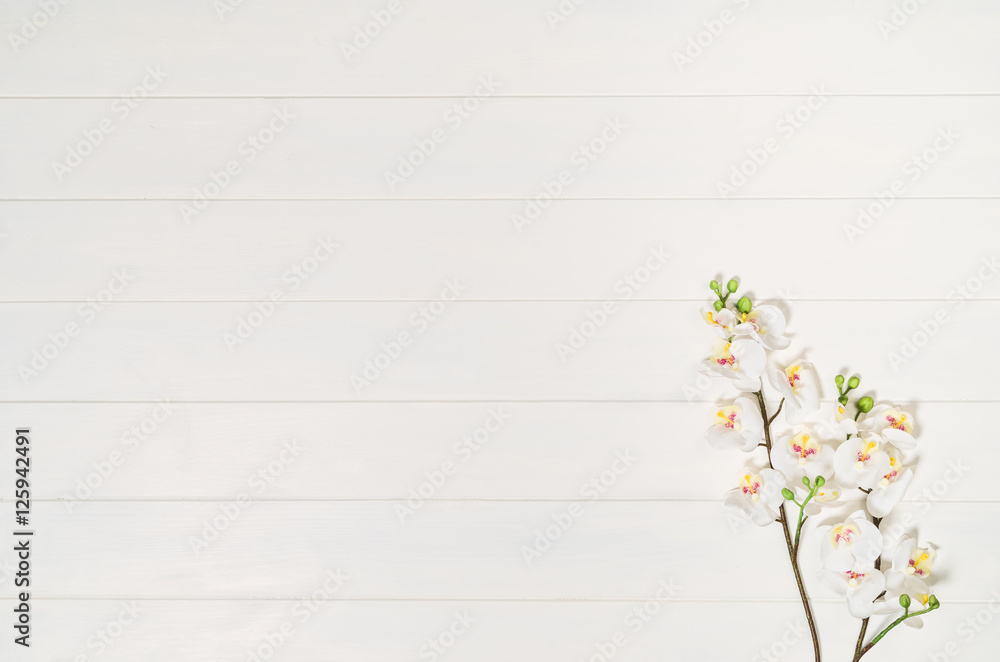 Woman's table, desk or workspace seen from above. Top view background with white wood and copy space
