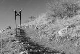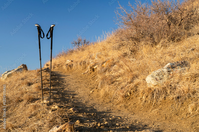pair of trekking poles at hiking trail in Colorado foothills
