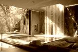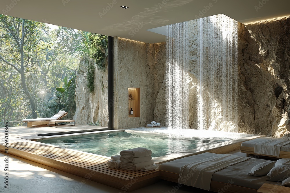 Relaxing spa retreat with indoor waterfall tropical forest interior design modern oasis tranquil escape