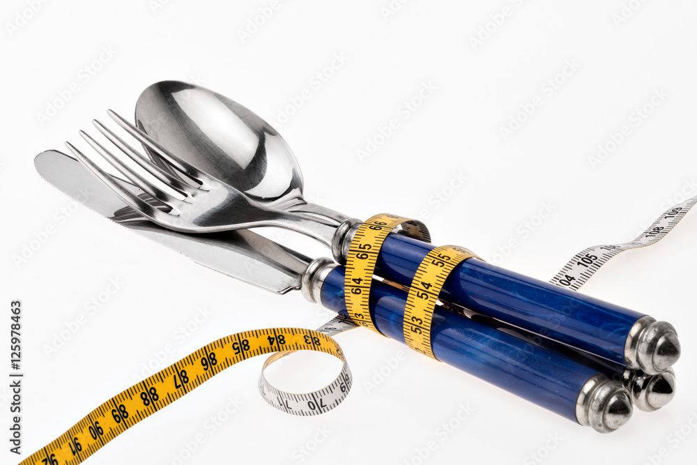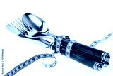 Besteck umwickelt mit einem Maßband, Symbol für eine Diät