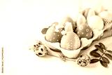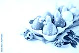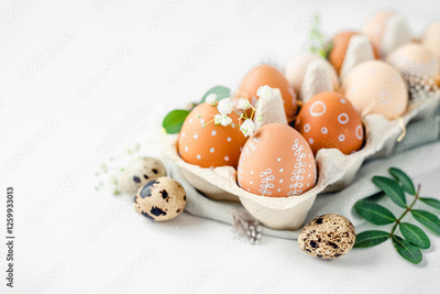 A delicate Easter background with hand-painted eggs in a box on a white table. Easter composition with flowers and feathers