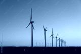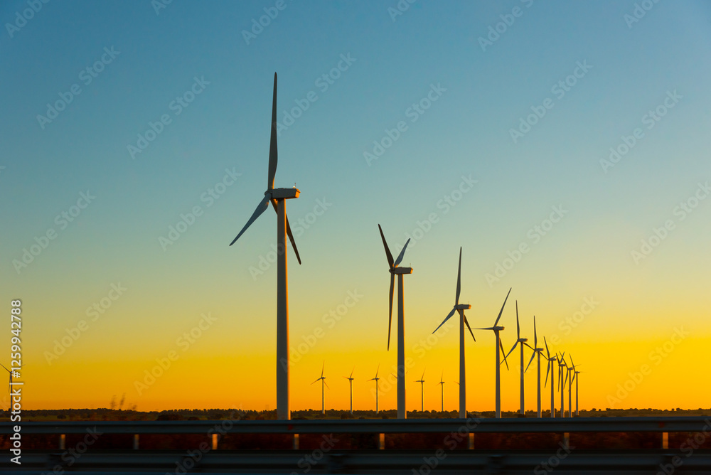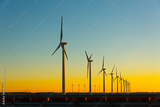 Clean energy and sustainability with wind turbines in a field at sunset. Idyllic silhouette countryside landscape in blue and yellow.