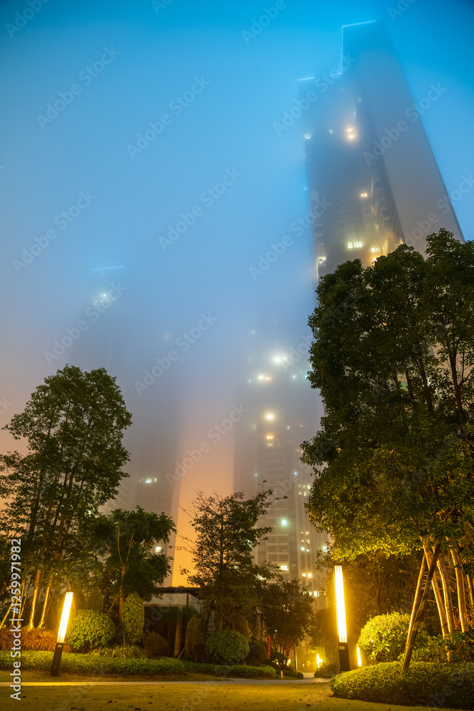 At night, the city shrouded in fog