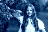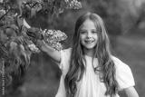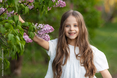 Cute happy little girl in a white dress is walking in a spring park near the bloom lilac flowers. A little girl near flowering lilac bush. Spring time concept. Children and nature. High quality photo