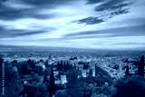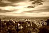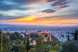 Palace and fortress complex Alhambra with Iglesia de Santa Maria, Palacios Nazaries and Alcazaba during sunset in Granada, Andalusia, Spain