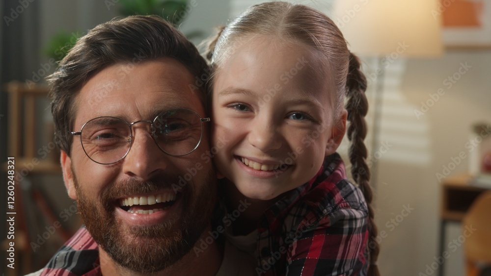 Caucasian family portrait Caucasian man male father good relationship smiling happy looking at camera little girl child kid daughter hugging cuddling embrace dad by neck at home insurance health loan