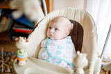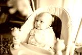 Cute adorable newborn baby sitting in swing. Closeup of peaceful child, little baby girl swinging and playing. Looking on toys. Family, birth, new life. Attentive child. Tiny girl wrapped in blanket.