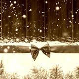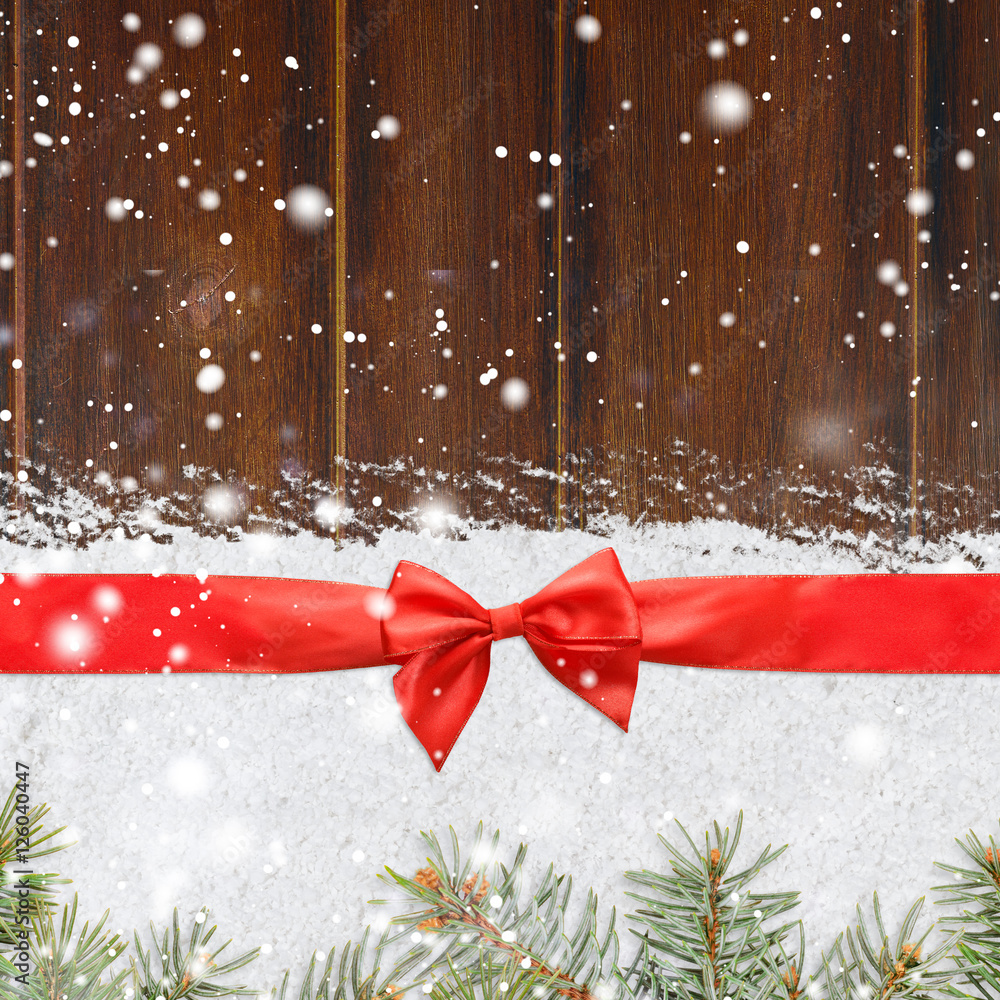 christmas card or new year background made of red satin ribbon with bow on snow and fir-tree branches over wooden table