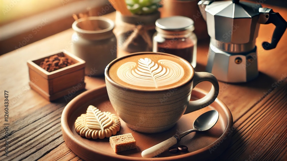Creamy cappuccino with intricate latte art, served with a cookie on a wooden table with rustic decor