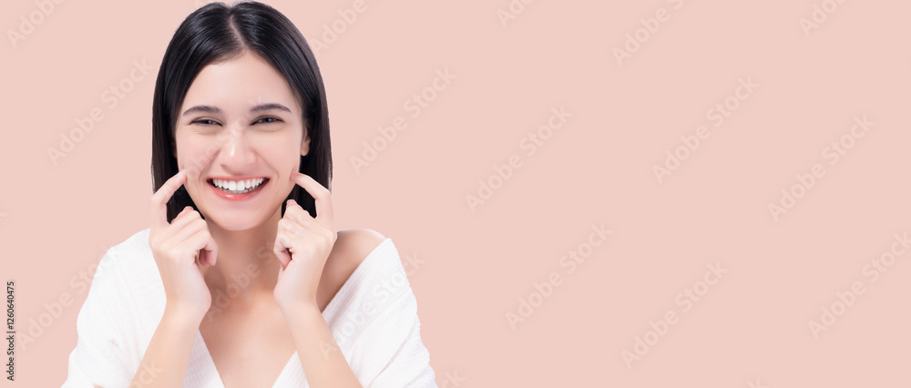 Cheerful young woman with bright smile pointing to cheeks, expressing happiness and confidence. Happy girl get Thooth Whitening Beautiful woman has beautiful tooth, white teeth, nice tooth alignment.