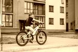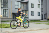 Preteen girl riding a bicycle in urban environment on a sunny day. Back view