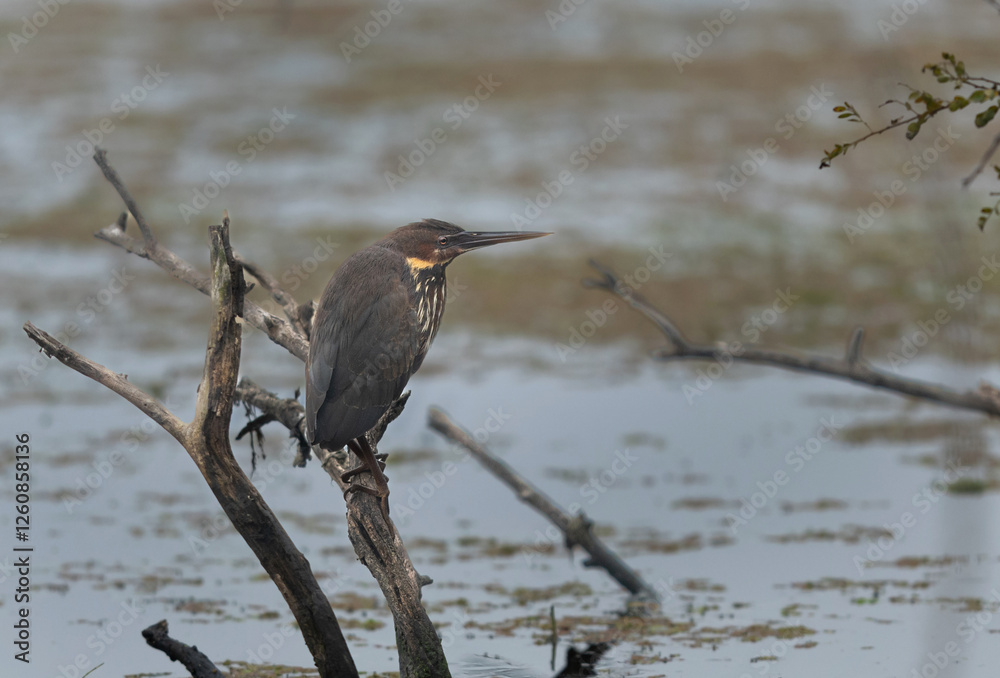 Black bittern perched on a wooden log at Keoladeo Ghana National Park, Bharatpur, India