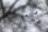 Painted storks flying at Keoladeo Ghana National Park, Bharatpur, India