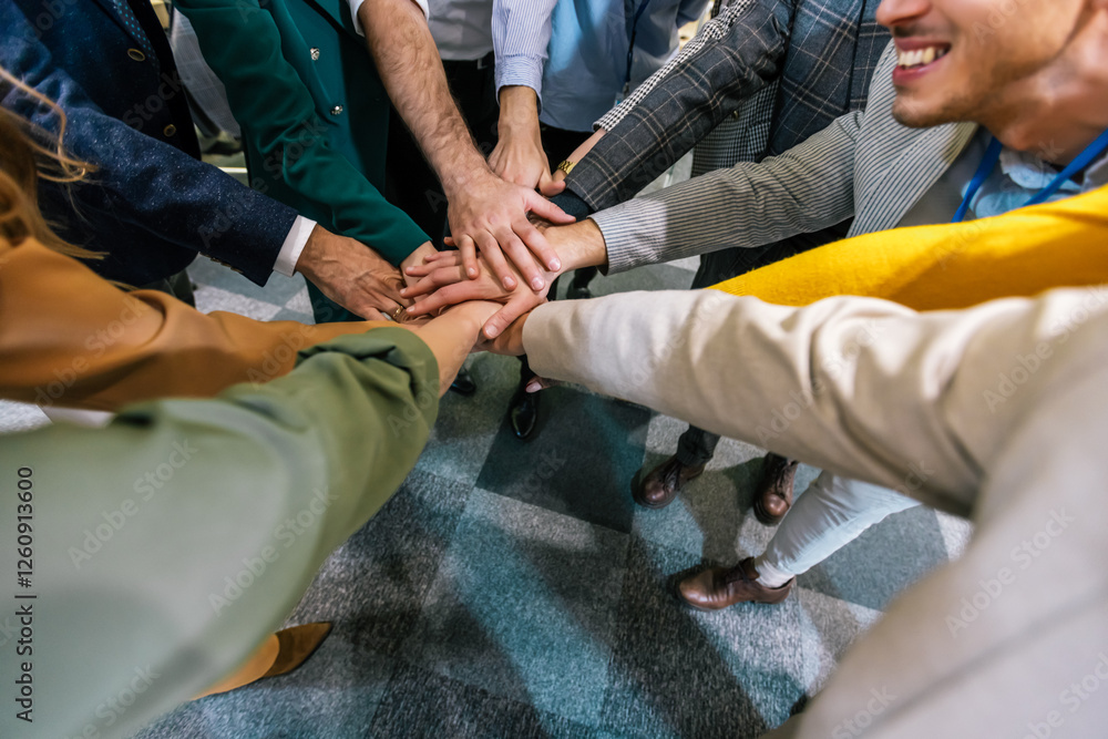 Stack of hands. Unity and teamwork in the office after an conference, seminar. Top view.