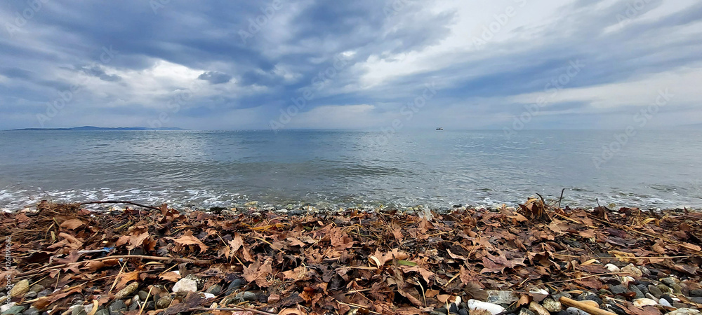 Dramatic view of the sea under heavy clouds, with fallen leaves on the shore, evoking a melancholic mood.