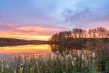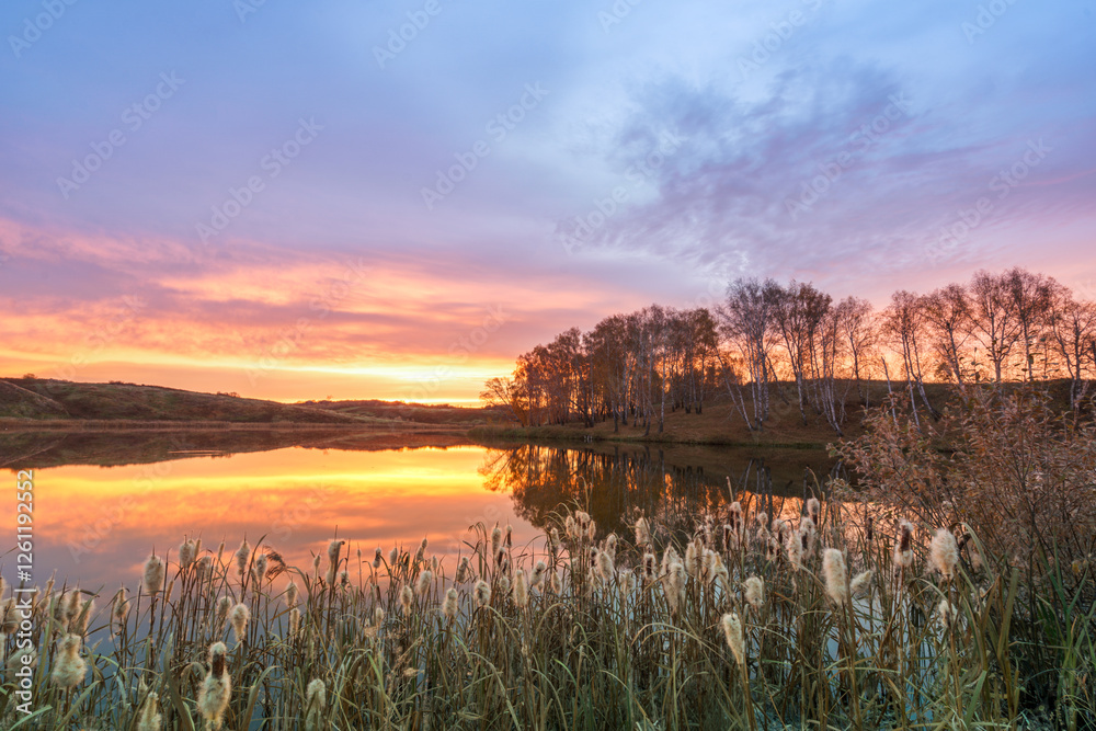 Colorful dawn in village of Osinovka on the lake shore in the Kurgan region of Russia