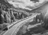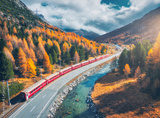 Aerial view of modern red train, river in alpine mountains, road, orange forest, sky with clouds at sunset in autumn. Bernina Express, Switzerland. Top view of train in Alps, winding railroad in fall