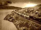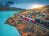 Aerial view of modern red train, turquoise mountain lake and dramatic cloudy sky at sunset in autumn. Bernina Express, Switzerland. Top view of train in Alps, winding railroad, orange hills. Travel