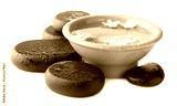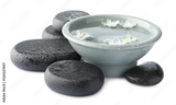 Wet spa stones and bowl of water with beautiful flowers isolated on white