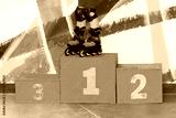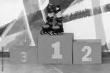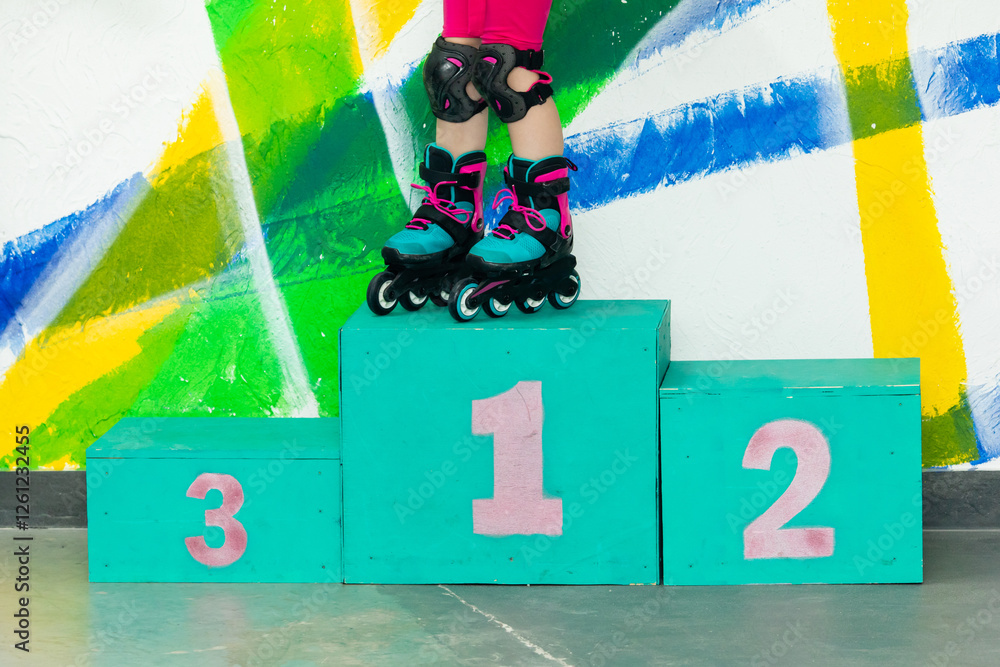 Close up child feet on podium for winners of first, second and third place. Victory and competition, challenges results for players or competitors participants.