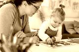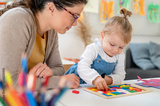 A caring teacher and a toddler girl engage in a hands-on learning activity with colorful wooden puzzles in a bright and organized classroom