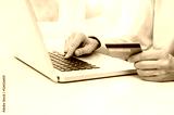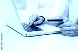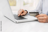 Male hands holding credit card and using laptop. Online shopping concept