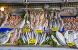 Freshly caught fish are displayed on a bed of ice at a bustling fish market, ready for sale