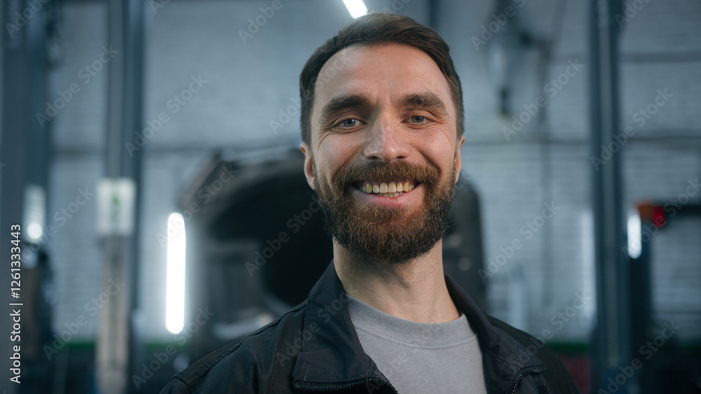 Happy man Caucasian bearded smiling male professional mechanic service manager auto engineer car serviceman technical worker posing in repair vehicle station garage looking at camera positive smile