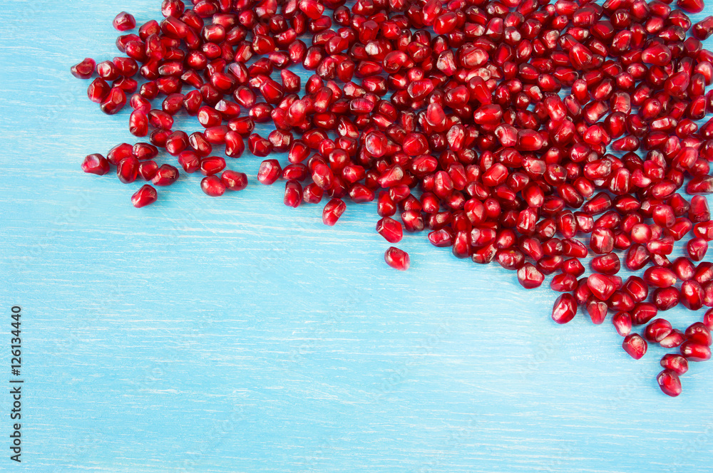 Background made of red pomegranate seeds. The scattered red grains of a pomegranate. Top view.