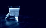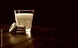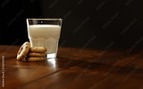 Cookies and glass of milk on wooden table with black smoky wall background.