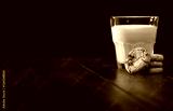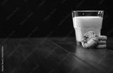 Cookies and glass of milk on wooden table with black smoky wall background.