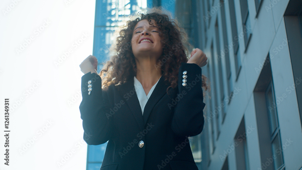 Happy excited joyful Caucasian woman female girl businesswoman lady celebrate scream shock surprise achievement delighted get job dream business success win celebrating amazement winner smile triumph