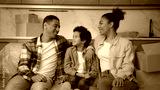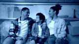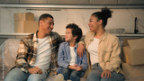 Happy joyful parents mom dad little child boy kid son together on couch relocation moving day smiling African American family home owners relax on sofa buy rent house real estate mortgage bank credit