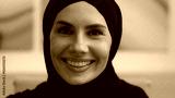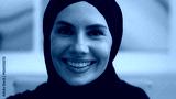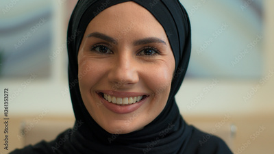 Close up portrait happy Arabian muslim Islamic woman in black hijab indoors cheerful smiling female face dental toothy smile smiling at camera joyful girl Islam religion faith eastern fashion beauty