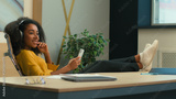 African American relaxed woman happy businesswoman female listening music in headphones enjoy audio carefree business lady manager listen song in earphones mobile phone ethnic girl relaxing in office