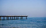 Many seagulls standing on a pier over a calm sea on a sunny day