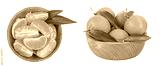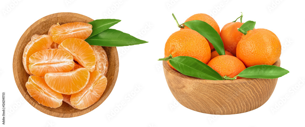 Tangerine or clementine slices in wooden bowl isolated on white background with full depth of field. Top view. Flat lay